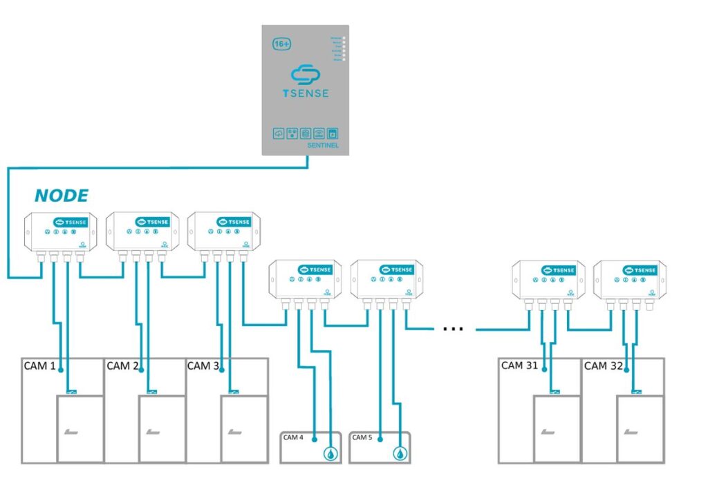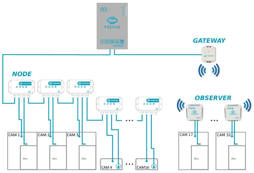 A rendszert olyan esetekben ajánljuk, amikor a Sentinel központi egység és a monitorozott pontok közötti távolság meghaladja a 15 métert. Az érzékelők Node-okra csatlakoznak, amelyek sorosan, maximum két ágon keresztül kapcsolódnak a központhoz.