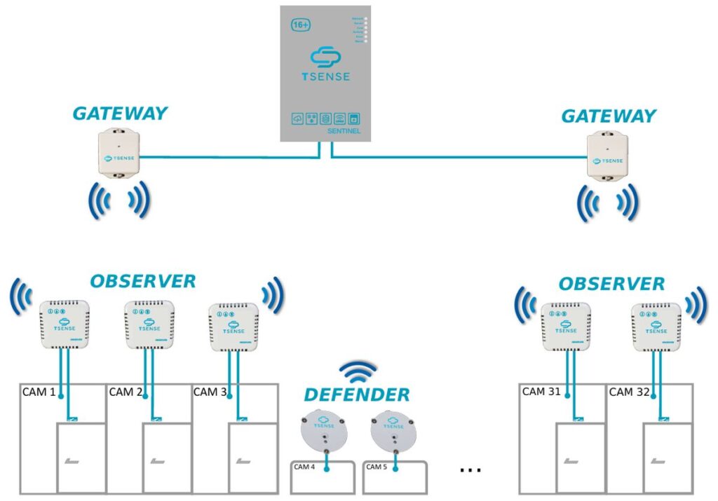 Akkor ajánlott, ha a monitorozott pontok egy vagy két folyosón belül helyezkednek el, és a kábelezés nem megoldható. A Gateway biztosítja a vezeték nélküli kapcsolatot az Observer érzékelők és a Sentinel központi egység között. Akár két Gateway is csatlakoztatható.